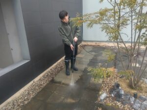 休日に、息子に手伝ってもらい店内入口と 中庭のコン